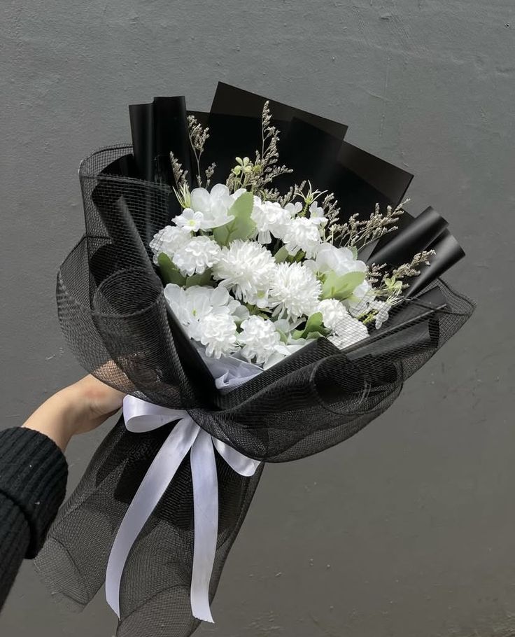 A graceful bouquet for a graceful graduate. Featuring pure white blooms and elegant black mesh wrapping, this arrangement captures the beauty of success and the dignity of academic achievement.