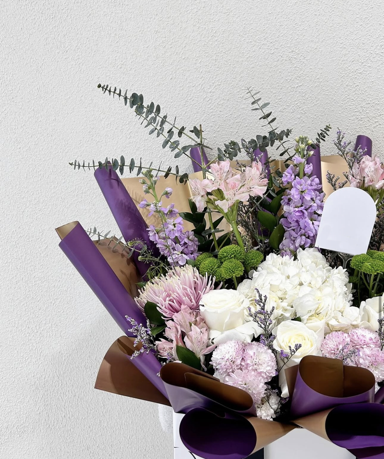 Celebrate academic excellence with this luxurious graduation flower box, featuring lush white, lilac, and pastel blooms artfully...