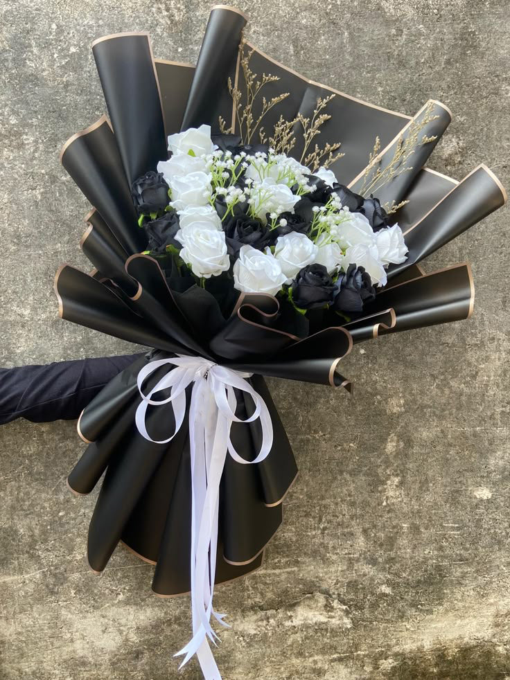 Celebrate academic excellence with this stunning bouquet of white and black roses, symbolizing wisdom, strength, and new beginnings. Wrapped in luxurious black and gold-accented paper, it's the perfect tribute to the graduate's success.